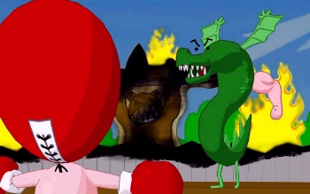 Soon later Alberich reappears and tells Mime to get the hell back to work. Seeing Wotan and Loge, he then demands to know what they want. Loge replies they just dropped by to see if Alberich was the really smart, all-powerful, all-around great guy they'd heard he was. Alberich laughs and demonstrates his power by transforming himself into a huge, evil, long-toothed, snarling, vicious, Class A, UL-approved dragon.