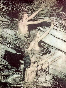 SCENE ONE: Under the Rhine river, the sexy Rhinemaidens are playing and cavorting in the water when the horny dwarf Alberich arrives. He propositions each one of them in turn; each one of them replies by saying something rude about the sexual habits of dwarves and laughing in his face. Alberich is getting really fed up with this behavior when he catches sight of gold on the sea-floor, and asks the Rhinemaidens about it. They explain that it is the Rheingold, and that any man who fashions it into a ring will become exceedingly rich and powerful for all time; however, to claim the gold, one must renounce all love forever. Alberich, who isn't getting any anyway, renounces love and flees with the gold of the Rhine. The Rhinemaidens squeal and shriek and bemoan their miserable fate.