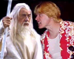 Soon Siegfried arrives and, seeing Wotan, demands to know where the mountain of fire is. Wotan, amused by Siegfried's youthful belligerence, or perhaps his stupidity, asks Siegfried a number of questions: who sent him there, why he fought a dragon, who reforged his sword and so on. When Wotan asks who made his father's sword to begin with, Siegfried says he's tired of all the questions and sick of stupid old men and dwarves continually standing in his way. Wotan, getting angry at such treatment from his grandson, threatens Siegfried with his spear, pointing out that it's destroyed that same magic sword before. "So you're the one who attacked my dad!" Siegfried screams. He swings the sword at Wotan and misses, but clumsily breaks Wotan's spear instead. Since all the agreements and contracts etched onto the spear are what give Wotan his power to rule, destroying it effectively puts him out of a job. He lets Siegfried pass and goes off looking for a good lawyer.