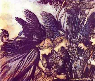 PRELUDE: The Norns, the daughters of Erda the earth-goddess, take the rope of fate and try to untangle the plot of the show. They describe how Wotan, irritated with the way the previous opera turned out, has cut down the World-Tree and surrounded Valhalla with stacks of dry kindling. As they try to determine what happens next the rope of fate they're weaving breaks. Realizing that even they can't make sense of the story, they immediately stop singing and leave the building.