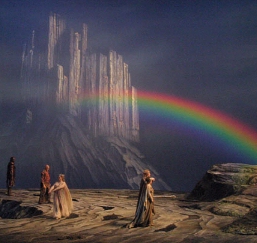 Things wind down soon after. The god Donner calls forth a storm, which makes a rainbow bridge to Valhalla. Most of the gods promptly hie off to Valhalla in hopes of claiming the better bedrooms for themselves. Wotan says everything's going to turn out fine. Loge suspects Wotan and the other gods are all going to end up being dead meat on a stick. Fafner leaves with the gold, the Tarnhelm, and the Ring. The Rhinemaidens squeal and shriek and bemoan their miserable fate.