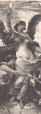 General Ulysses S. Grant graces the left side of the $5 note's reverse, with General Philip Sheridan on the right and a winged and shielded Liberty in between. One can only imagine how this note was received in the South, issued only thirty-one years after the Civil War with two victorious Northern generals pictured on the back. Though the two side portraits were engraved by Lorenzo Hatch, the face of Liberty has been said to "greatly resemble the wife of Thomas F. Morris"; this suggests, quite reasonably, that the central figure and the beautiful lathe-work were his.