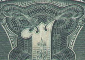 Will H. Low's design for the $1 note, entitled History Instructing Youth, shows a female History with a young student standing beside her, gesturing to an open book of history before her. An olive branch rests against the book, holding it open to show the Constitution of the United States upon the page. Both the Washington Memorial and the Capitol Dome can be seen in the background landscape. The outside border of the note shows 23 wreaths, each bearing the name of a noteworthy American - not surprisingly starting with Washington, Jefferson and Franklin, but also including such names as poet Henry Longfellow, inventor Robert Fulton, and author Nathaniel Hawthorne, among many others. The seal of the Treasury appears in the lower right.